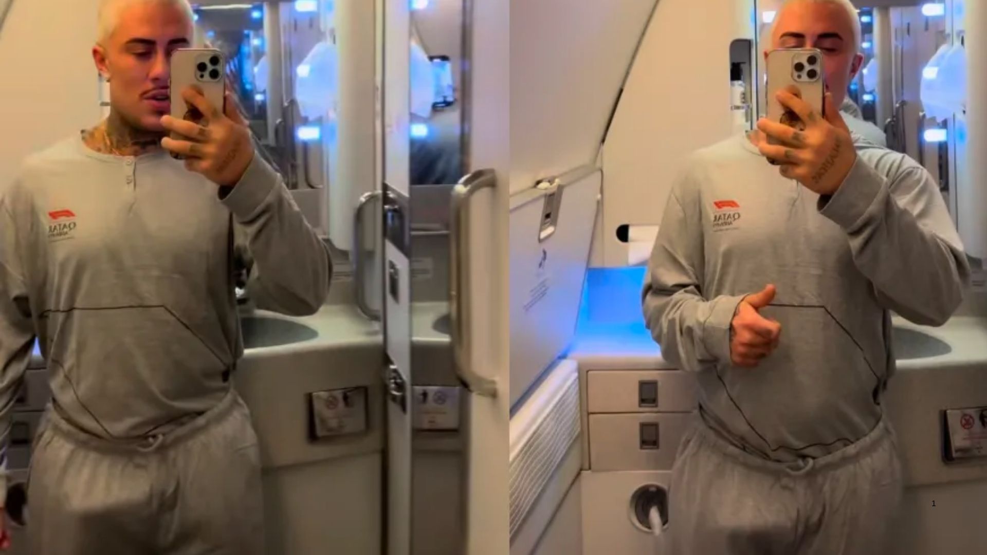 MC Daniel chamou atenção dos seguidores neste domingo (29), ao compartilhar um vídeo nos stories enquanto viajava de avião para o Japão, onde fará um show. O registro foi feito dentro do banheiro da aeronave, e o artista exibiu o pijama oferecido pela companhia aérea, que acabou rendendo comentários sobre o volume em sua calça.