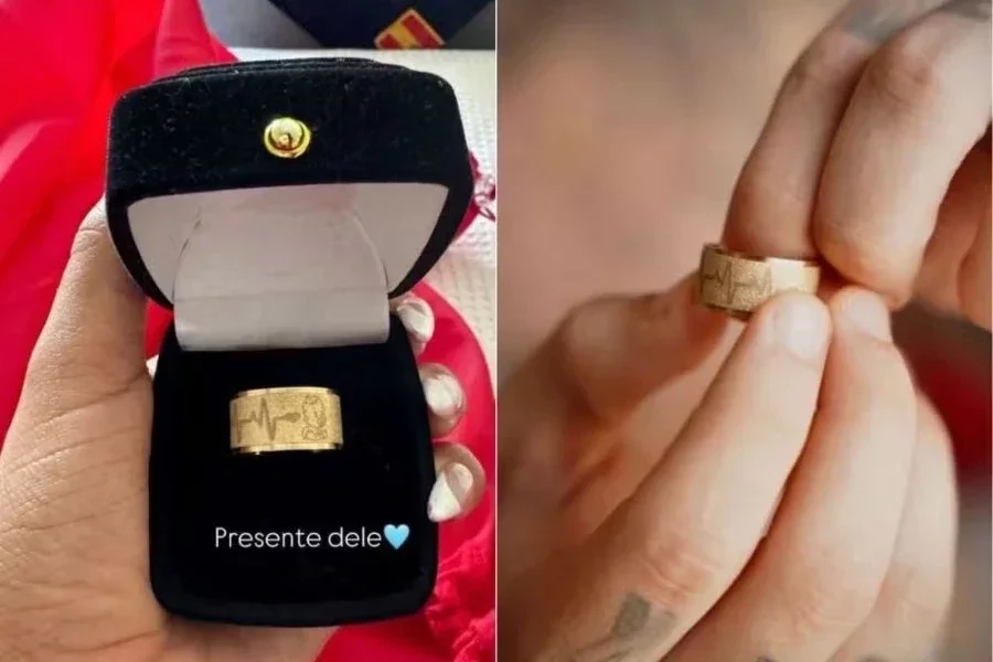 Em seu perfil no Instagram, a influenciadora compartilhou todos os detalhes do mimo. O anel de ouro é todo personalizado com os batimentos cardíacos e o desenho de um bebê. Ela se derreteu com o presente do namorado. "Presente dele", disse ela.