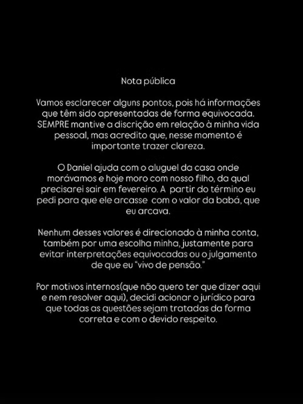 "O Daniel ajuda com o aluguel da casa onde morávamos e hoje moro com nosso filho, da qual precisarei sair em fevereiro", afirmou.