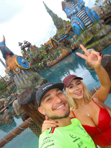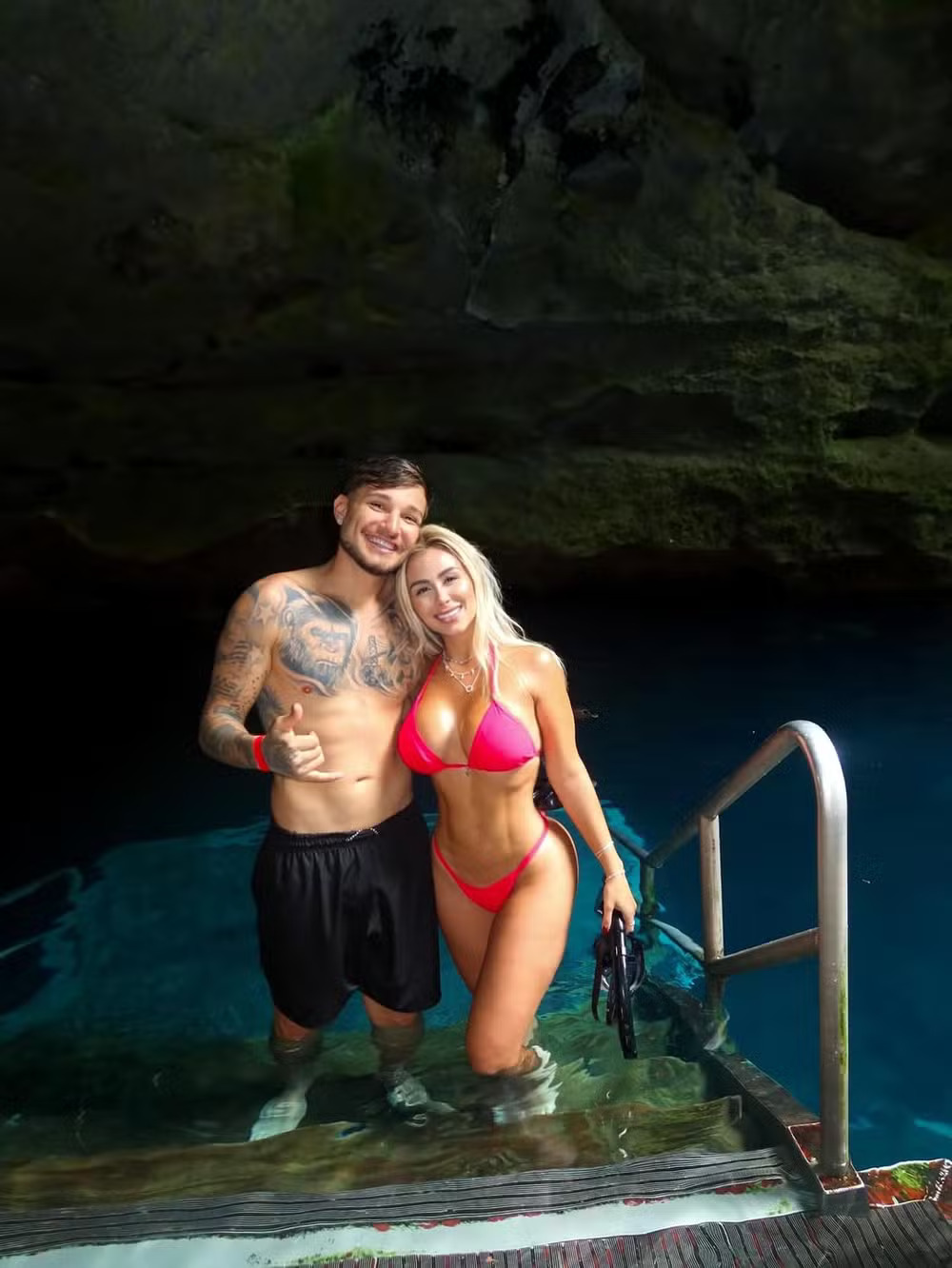 Nas imagens, o casal aparece se divertindo em parques de diversão americanos e explorando uma gruta com água azul cristalina. Para completar o momento de lazer, Georgia escolheu um biquíni fio-dental rosa neon para o mergulho.