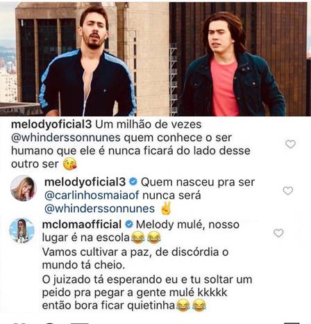 Em sua rede social oficial, Melody declarou: “Um milhão de vezes Whindersson Nunes quem conhece o ser humano que ele é nunca ficará do lado desse outro ser”. A cantora mirim ainda completou: "Quem nasceu para ser Carlinhos Maia nunca será Whindersson Nunes".
