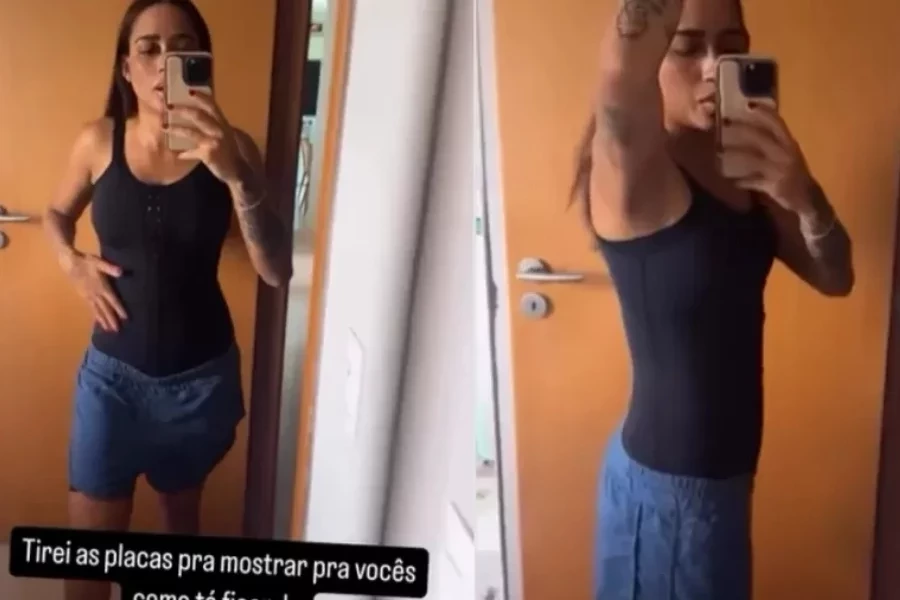 "Gente, eu tirei as placas para mostrar para vocês, porque eu fico toda quadrada com elas. Olha essa cintura! Falem dela, mas falem baixo, viu? Não vejo a hora de colocar um biquíni", disse.