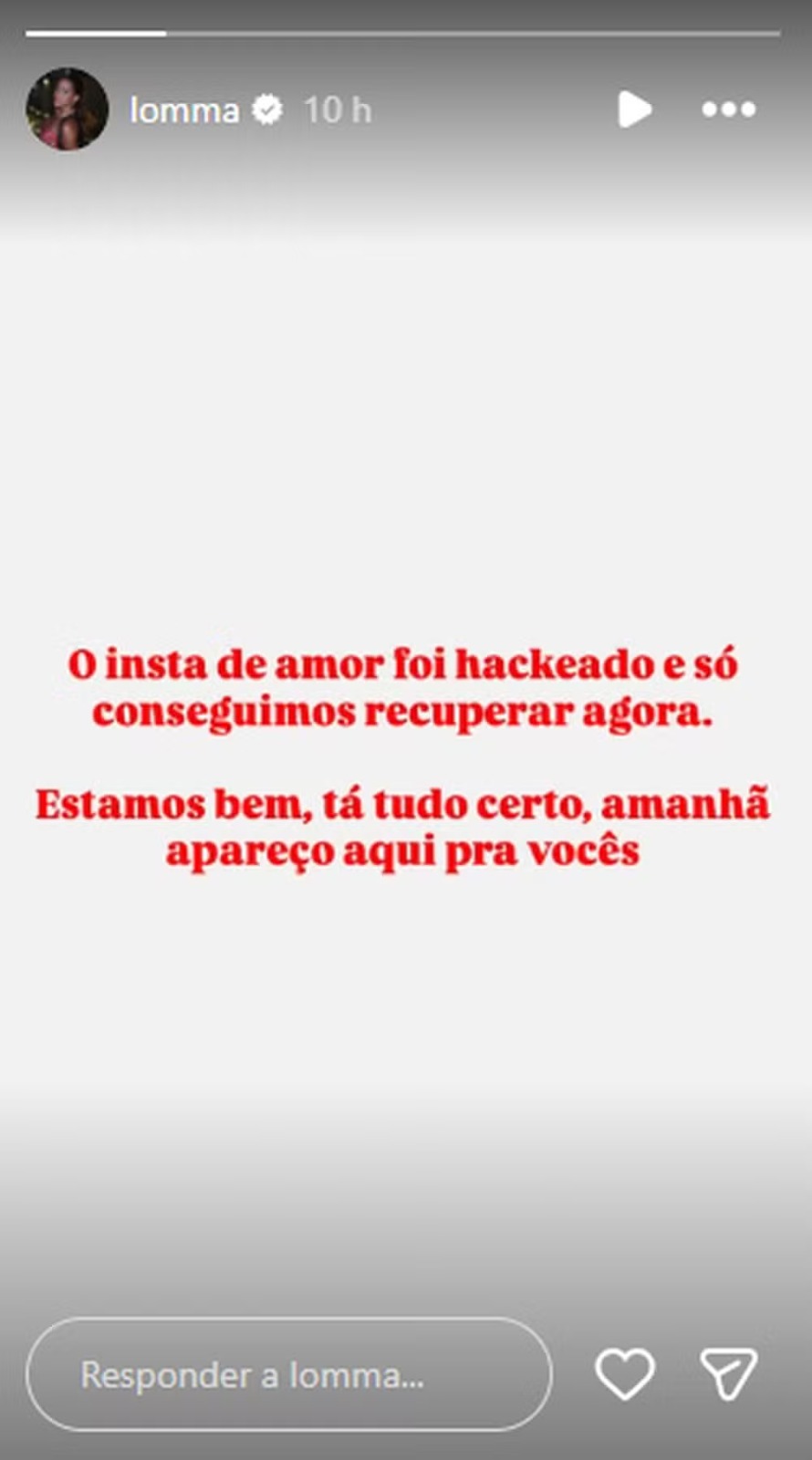 “O Insta de amor foi hackeado e só conseguimos recuperar agora. Estamos bem, tá tudo certo, amanhã apareço aqui pra vocês”, escreveu.