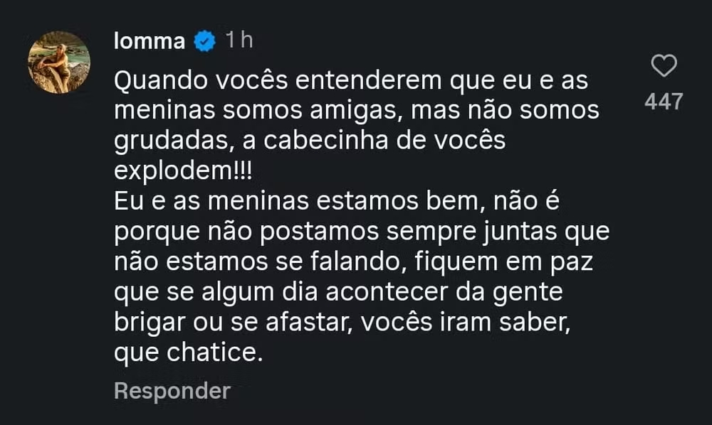 Em comentário publicado em página sobre celebridades, Lomma afirmou que a amizade entre elas permanece intacta, mesmo que não estejam sempre juntas publicamente: