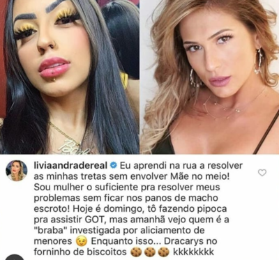 Sem papas na língua, Lívia não ficou quieta e rebateu a provocação. “Eu aprendi na rua a resolver as minhas tretas sem envolver mãe no meio! Sou mulher o suficiente para resolver meus problemas sem ficar nos panos de macho escroto! Hoje é domingo, estou fazendo pipoca para assistir Game of Thrones, mas amanhã vejo quem é a 'braba' investigada por aliciamento de menores", alfinetou ela.