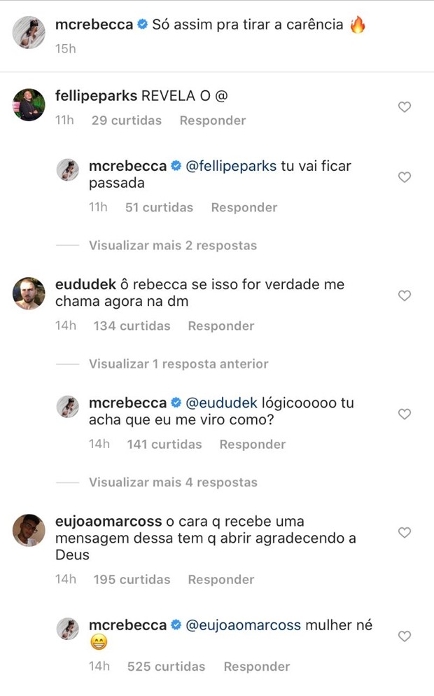 Nos comentários, os fãs ficaram curiosíssimos para saber com quem Rebecca estava falando. "Revela o @", pediu um seguidor. "Tu vai ficar passada", disse a funkeira, bem-humorada.