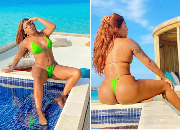 De biquíni verde neon, ela fez pose na piscina do hotel em que está hospedada com a namorada, Brunna Gonçalves.