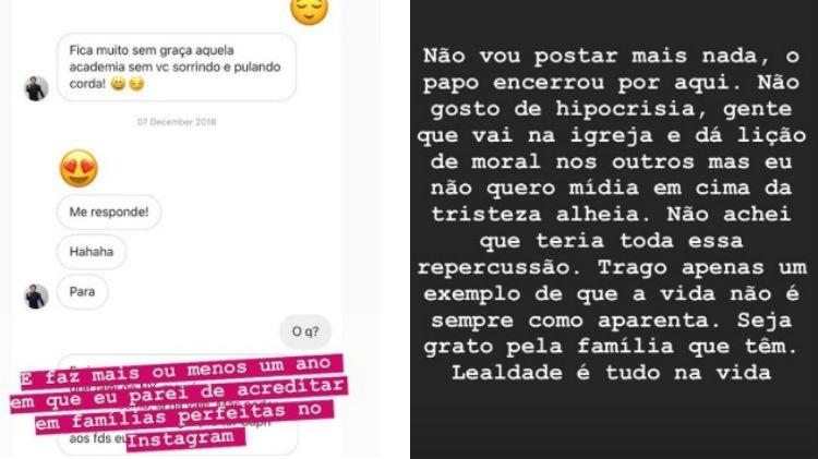 Ele ainda teria enviado emoji apaixonado. "Me responde!", diz, antes de dar uma risada. A modelo ainda publicou um breve esclarecimento e afirmou que não se manifestaria novamente. "Não vou postar mais nada, o papo encerrou por aqui. Não gosto de hipocrisia, gente que vai na Igreja e dá lição de moral nos outros, mas eu não quero mídia em cima da tristeza alheia".