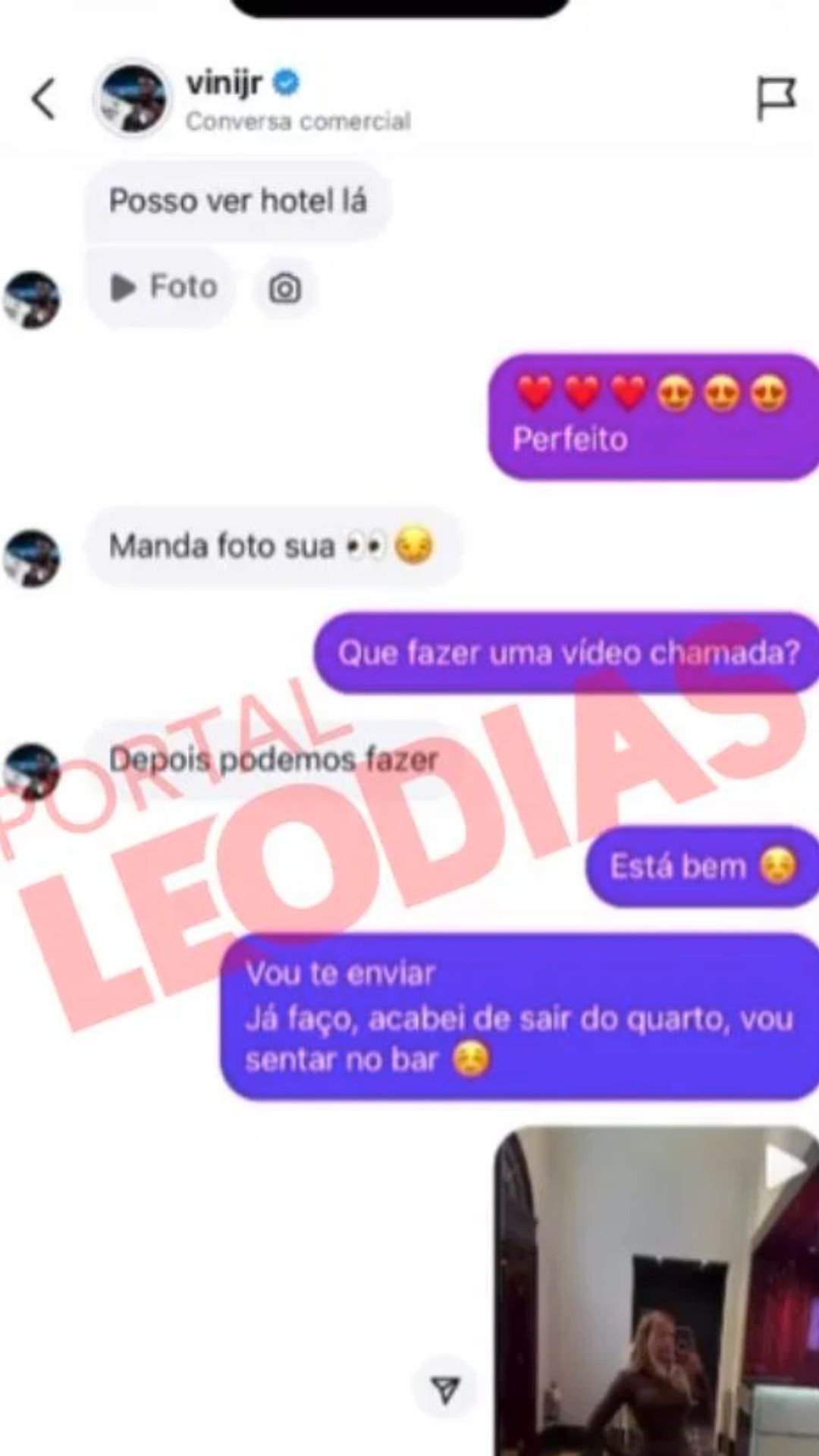 De acordo com o site, o contato entre Vinicius e Day teria começado há alguns meses e se mantido frequente desde maio. Nas supostas capturas de tela, o jogador reage a publicações da modelo com emojis e elogios, demonstra interesse em chamadas de vídeo e chega a mencionar possíveis encontros.