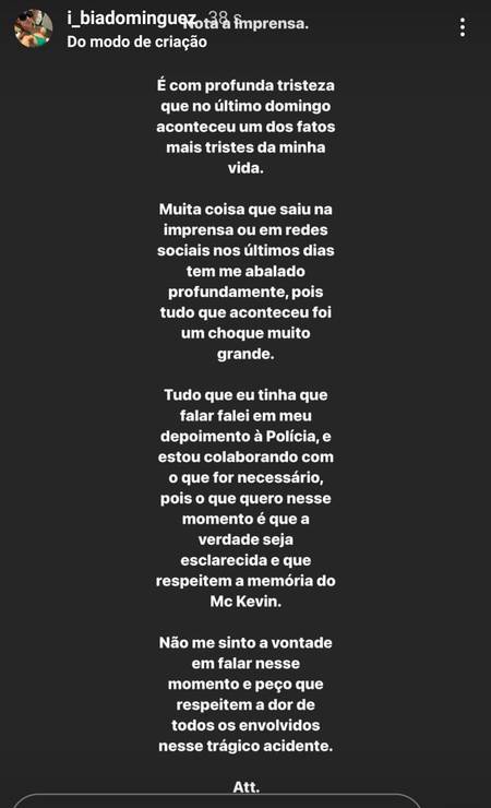 Ela afirmou que já depôs na polícia e está colaborando com as investigações. Pediu ainda que a memória de MC Kevin seja respeitada, assim como "a dor de todos os envolvidos nesse acidente".