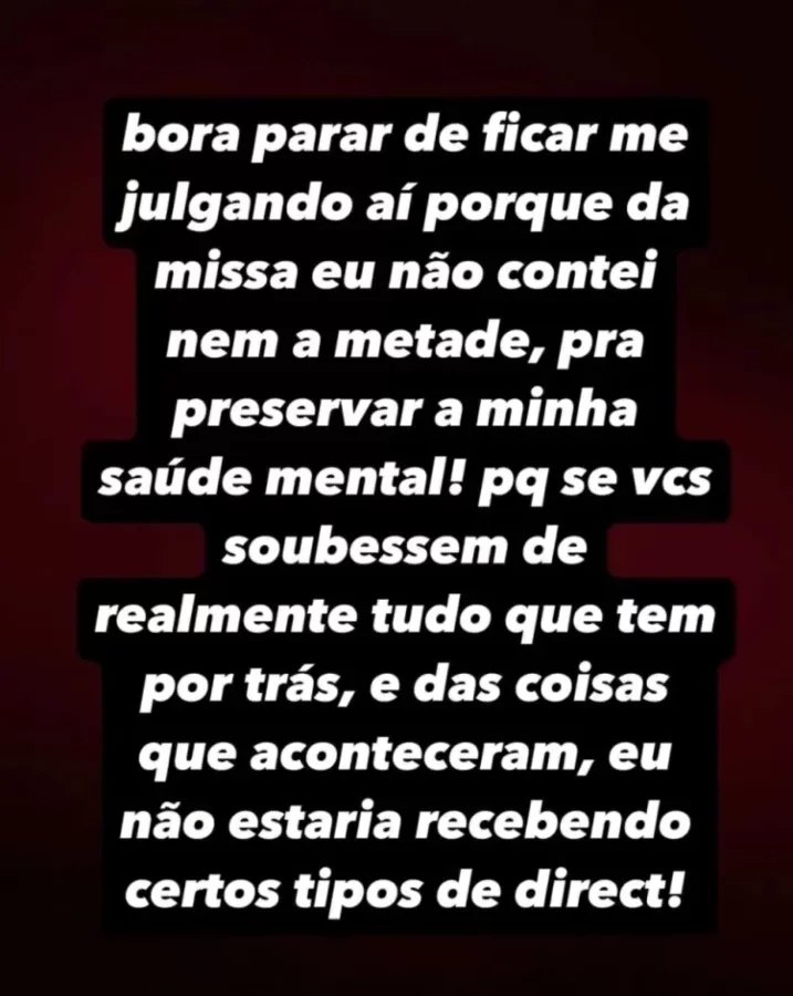 "Bora parar de ficar me julgando aí, porque da missa eu não contei nem a metade, para preservar a minha saúde mental. Porque se vocês soubessem de realmente tudo que tem por trás e das coisas que aconteceram, eu não estaria recebendo certos tipos de direct", escreveu na publicação.