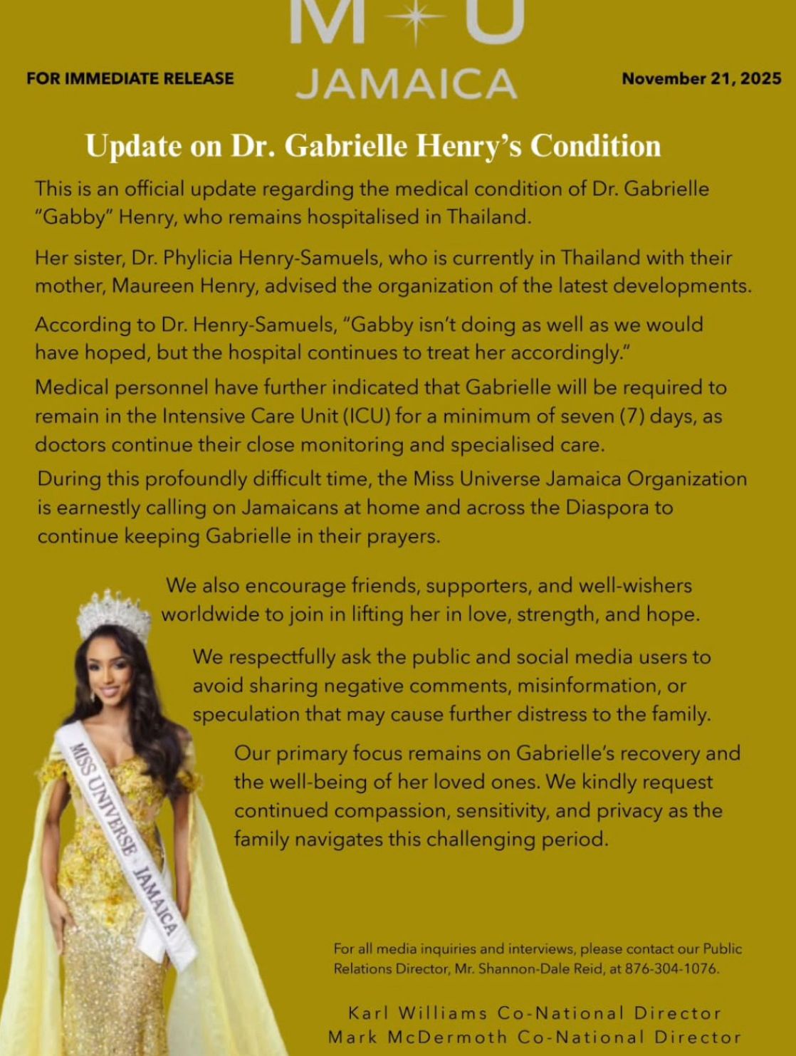 A Organização Miss Universo Jamaica informou que a irmã da modelo, Phylicia Henry-Samuels, viajou para a Tailândia acompanhada da mãe para acompanhar o tratamento. Segundo Phylicia, a modelo deve permanecer na UTI por pelo menos sete dias.
