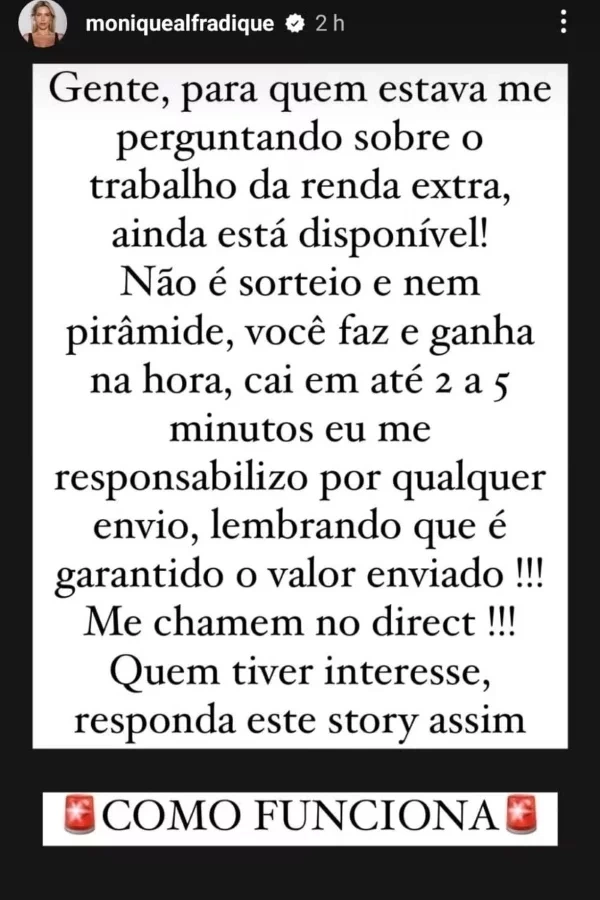 Monique disse que perdeu o acesso repentinamente. Ela contou que estava em uma chamada quando a ligação caiu. Ao tentar acessar sua conta no WhatsApp, percebeu que havia sido desconectada, e o mesmo ocorreu com seu perfil do Instagram.