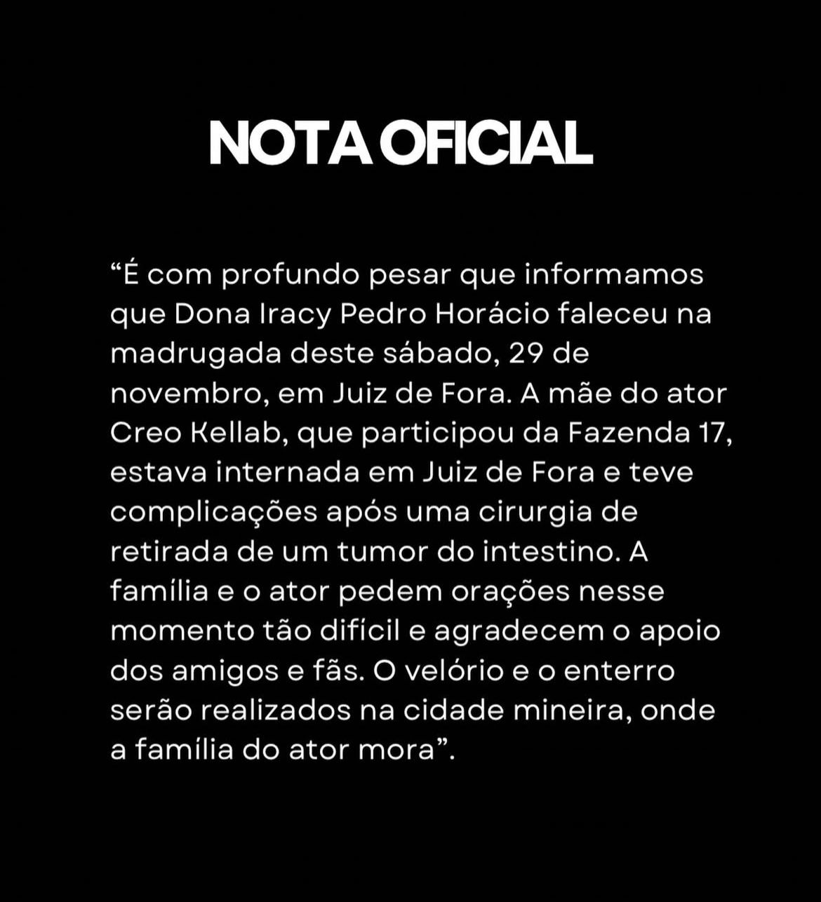 "É com profundo pesar que informamos que Dona Iracy Pedro Horácio faleceu na madrugada deste sábado, 29 de novembro, em Juiz de Fora. A mãe do ator Creo Kellab, que participou da Fazenda 17, estava internada em Juiz de Fora e teve complicações após uma cirurgia de retirada de um tumor do intestino. A família e o ator pedem orações nesse momento tão difícil e agradecem o apoio dos amigos e fãs. O velório e o enterro serão realizados na cidade mineira, onde a família do ator mora", disse a nota.