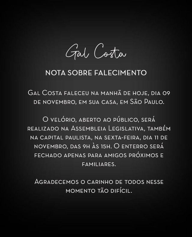 No perfil oficial do Instagram, foi noticiado a morte da estrela: 'É com profunda tristeza e o coração apertado que comunicamos o falecimento da cantora Gal Costa, na manhã desta quarta-feira, 09 de novembro, em São Paulo. Informações sobre o velório e sepultamento serão divulgadas posteriormente'.