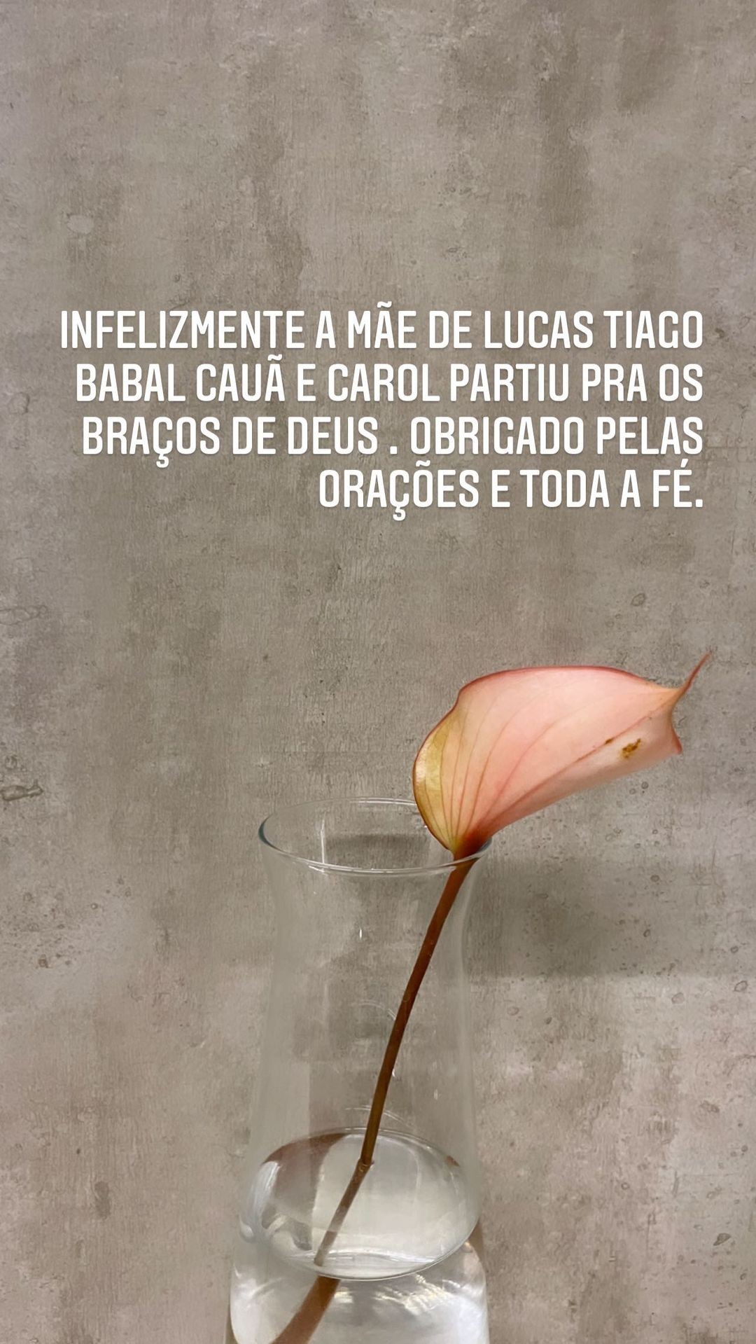 A notícia foi dada por Carlinhos, que postou um Stories avisando "Infelizmente a mãe de Lucas, Tiago, Babal, Cauã e Carol partiu para os braços de Deus. Obrigado pelas orações e toda fé".