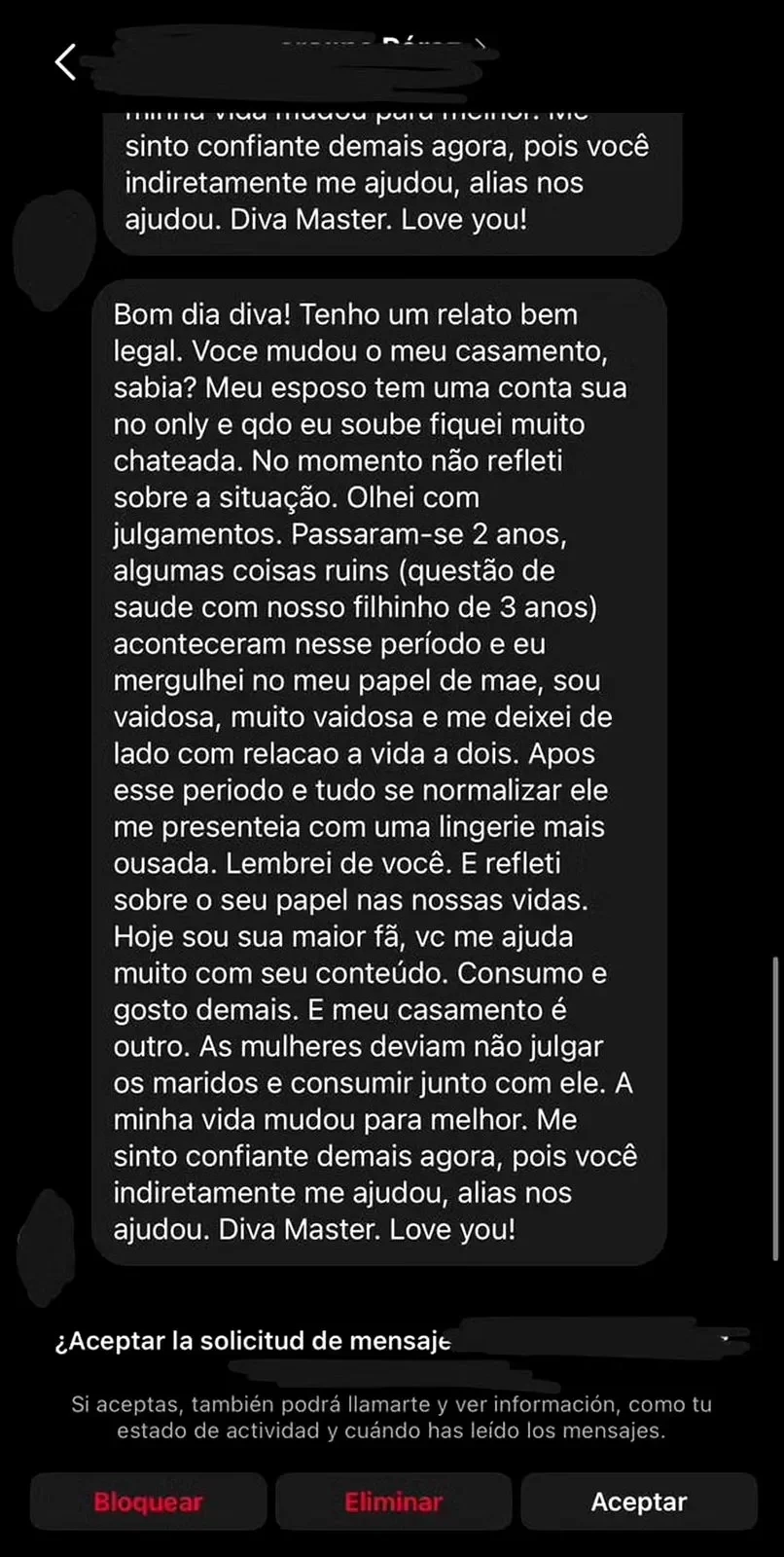 Com o tempo, seu marido a presenteou com uma lingerie, o que a fez refletir sobre o papel da influenciadora em sua vida. "Hoje sou sua maior fã! Seu conteúdo me ajuda muito, e meu casamento é outro", escreveu a internauta, acrescentando que o conteúdo de Renata trouxe mais confiança e mudou sua perspectiva sobre o relacionamento.