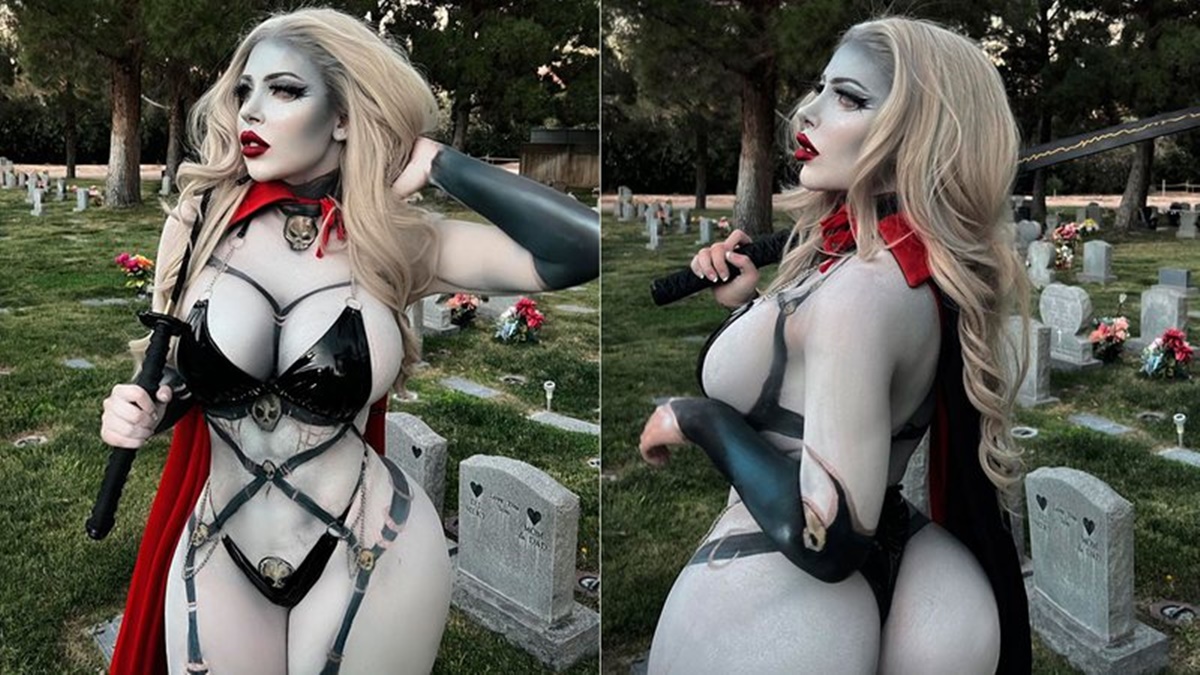 “Dê uma nota de 1 a 100 para o meu cosplay de Lady Death. Em outubro nós celebramos o halloween o mês inteiro”, legendou ela.