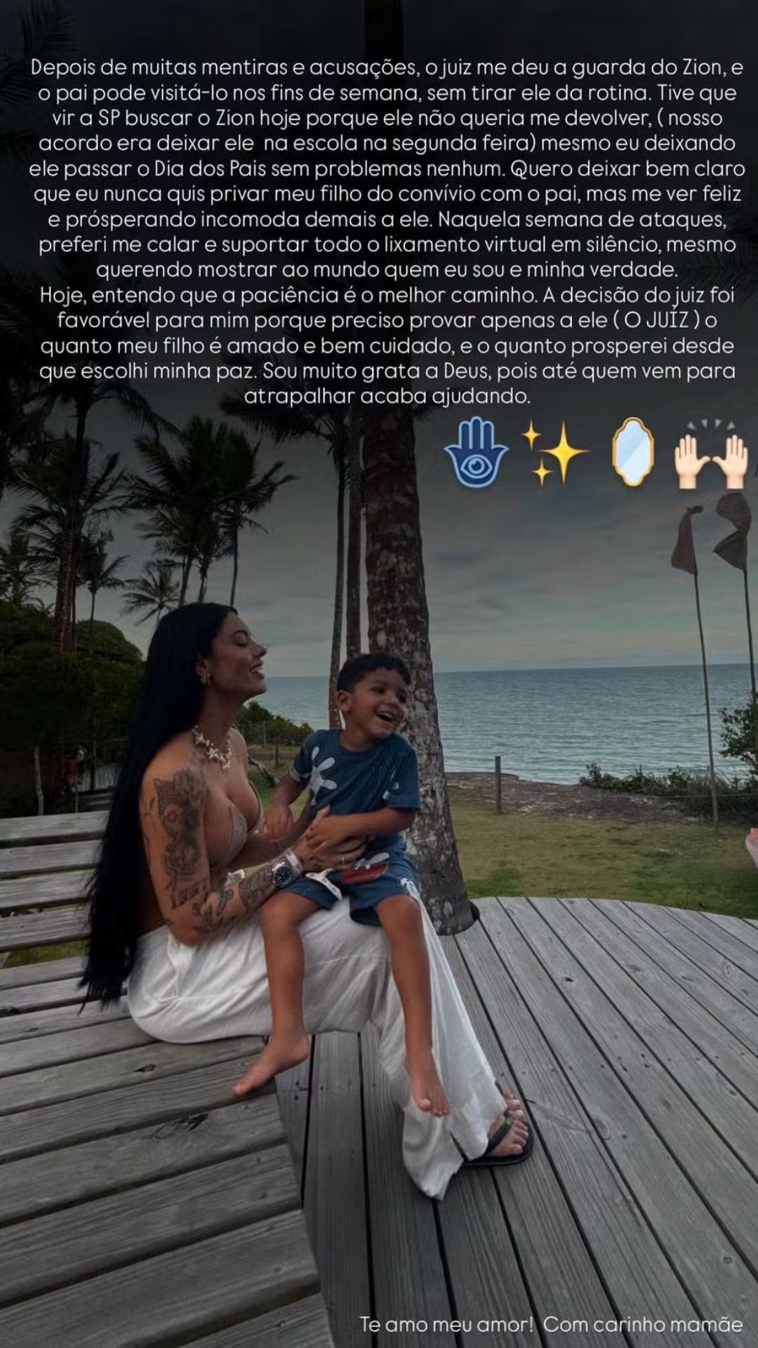 Depois de muitas mentiras e acusações, o juiz me deu a guarda do Zion, e o pai pode visitá-lo nos fins de semana, sem tirar ele da rotina. Tive que vir a São Paulo buscar o Zion hoje porque ele não queria me devolver, mesmo eu deixando ele passar o Dia dos Pais sem problemas nenhum. Quero deixar bem claro que eu nunca quis privar meu filho do convívio com o pai, mas me ver feliz e prósperando incomoda demais a ele.