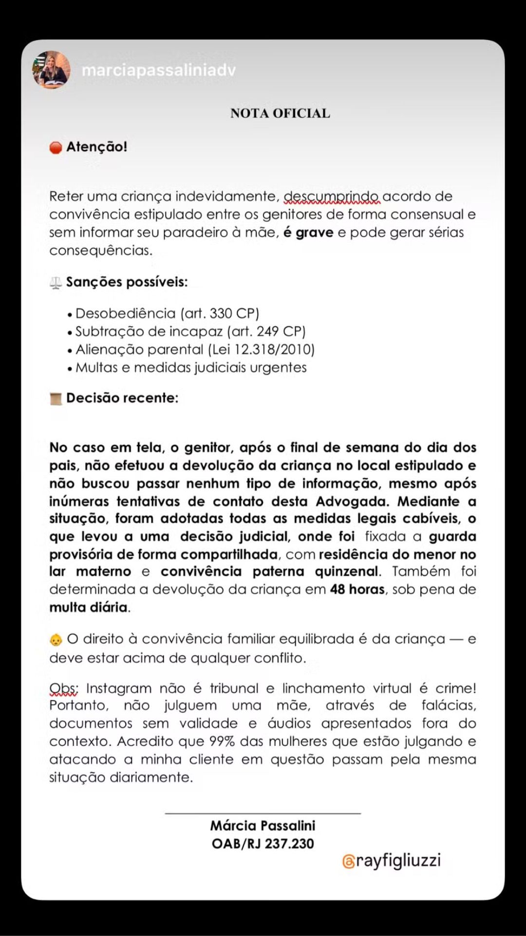 Em seu desabafo, Rayane compartilhou capturas de tela para comprovar que o ex-companheiro não respondeu às tentativas de contato da advogada. Ela ressaltou que interrompeu compromissos para buscar Zion. “Eu larguei tudo que eu tava fazendo em buscar meu filho, porque ele tem uma rotina”, afirmou.