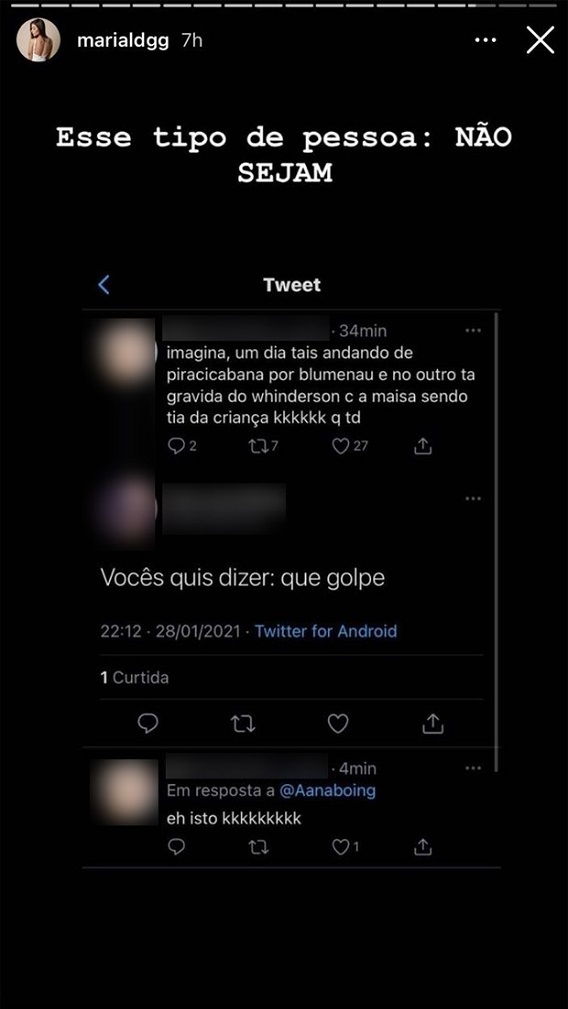 Após anunciar a gravidez do primeiro filho com Whindersson Nunes, Maria Lina teve que lidar com comentários maldosos acerca de suas intenções com o humorista. Pelos stories do Instagram, a estudante compartilhou um print screen de duas pessoas chamando-a, indiretamente, de "golpista". "Imagina, um dia está andando de Piracicabana por Blumenau, e no outro está grávida do Whindersson, com a Maisa sendo tia da criança. Que tudo", declarou uma internauta. "Você quis dizer: que golpe", respondeu outra. "É isto", concordou a primeira.