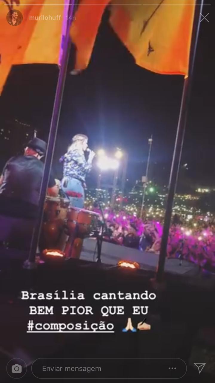 Marília Mendonça se apresentou, na noite da última quarta-feira (29), em Brasília. A cantora levou o projeto Todos os Cantos para para multidão que a esperava. Quem acompanhou o show dos bastidores foi seu namorado, Murilo Huff. O músico publicou um vídeo em seu Instagram, mostrando o público animado entoando o hit Bem Pior Que Eu, composto por ele. As informações são da Revista Quem.