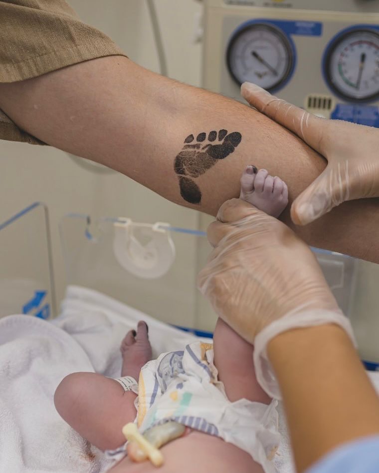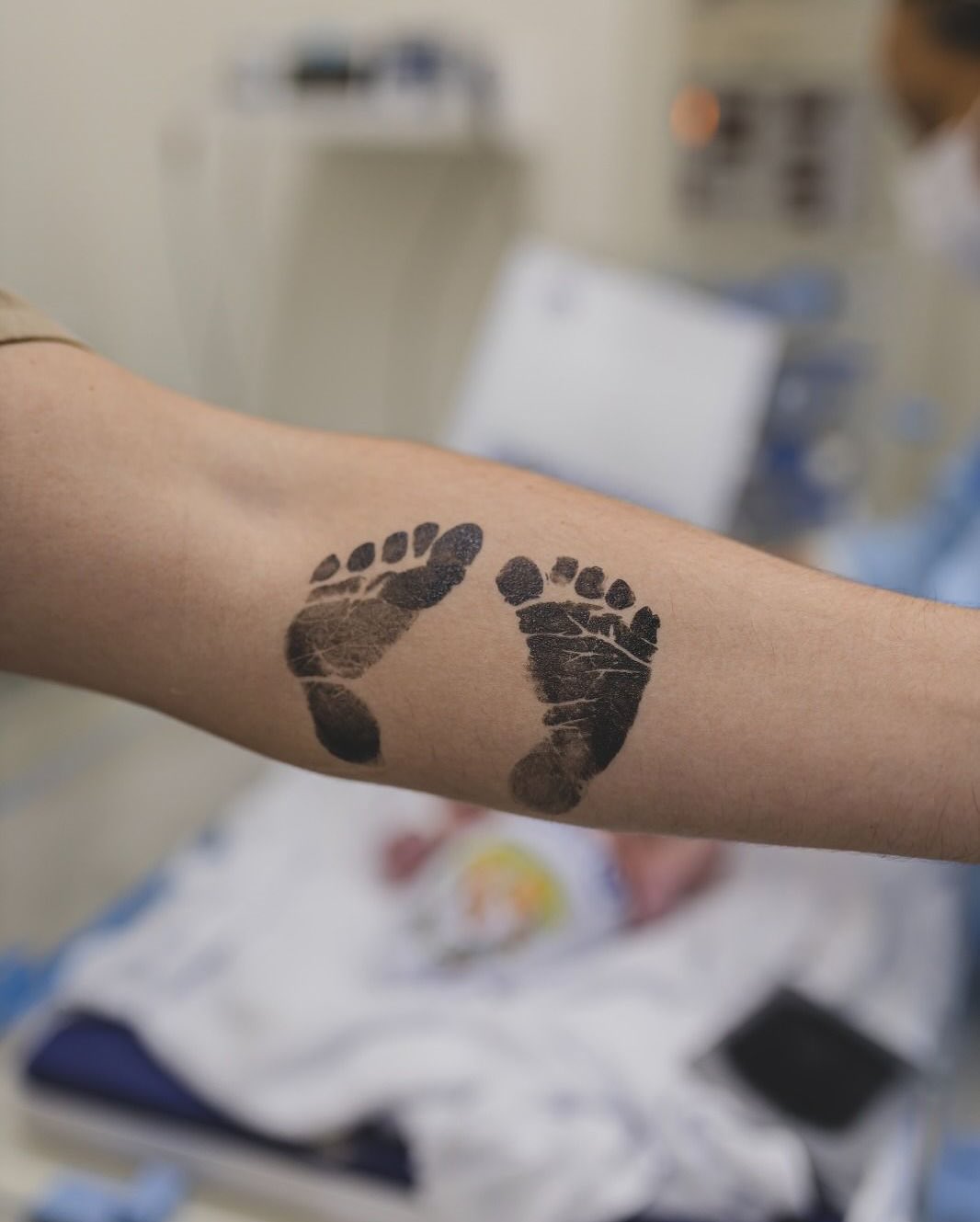 Dani publicou uma foto tirada logo após o nascimento do bebê. Na imagem, é possível ver os pés do recém-nascido sendo segurados por mãos com luvas.