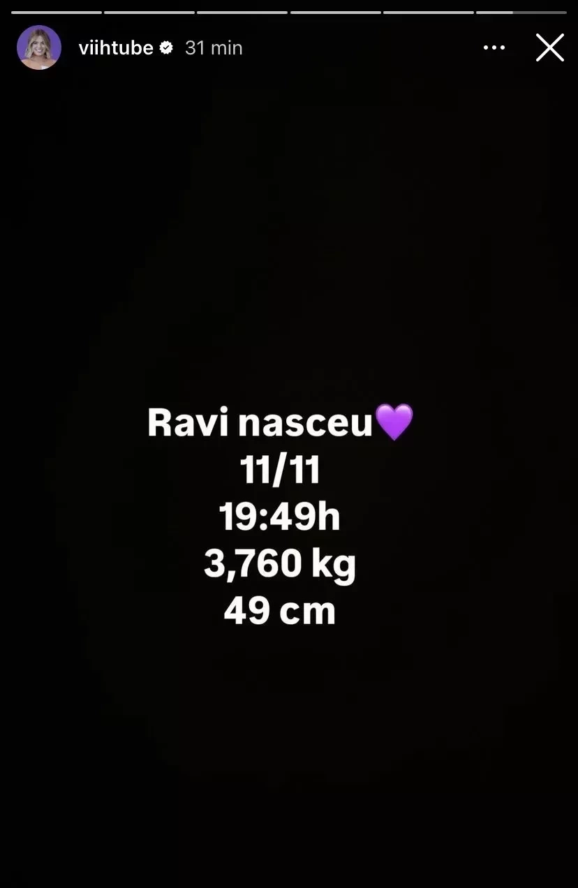 Viih Tube, de 24 anos, e Eliezer, de 34, celebraram o nascimento do segundo filho, Ravi, nesta terça-feira (12). O menino nasceu na segunda-feira (11), às 19h49, com 3,76 quilos e 49 centímetros, conforme divulgado pela assessoria da ex-BBB. O casal, que se conheceu em maio de 2022, já é pai de Lua Di Felice, de um ano, nascida em abril de 2023.
