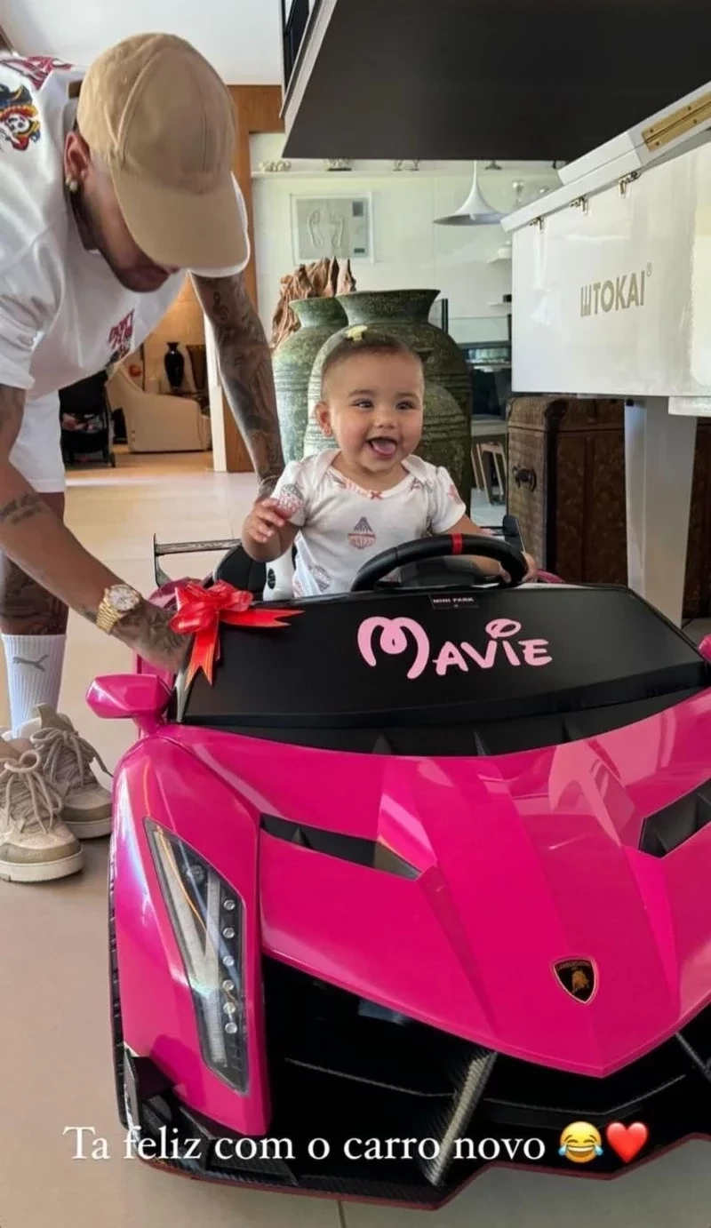 Neymar presenteou a filha Mavie, de oito meses, com uma mini Lamborghini cor-de-rosa avaliada em mais de R$ 5 mil. O presente veio em comemoração ao batizado da pequena, que aconteceu no último sábado (8).