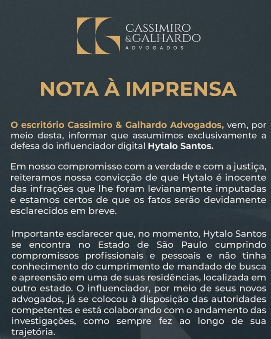 “O escritório Cassimiro & Galhardo Advogados, vem, por meio desta, informar que assumimos exclusivamente a defesa do influenciador digital Hytalo Santos”, disse o escritório em nota.