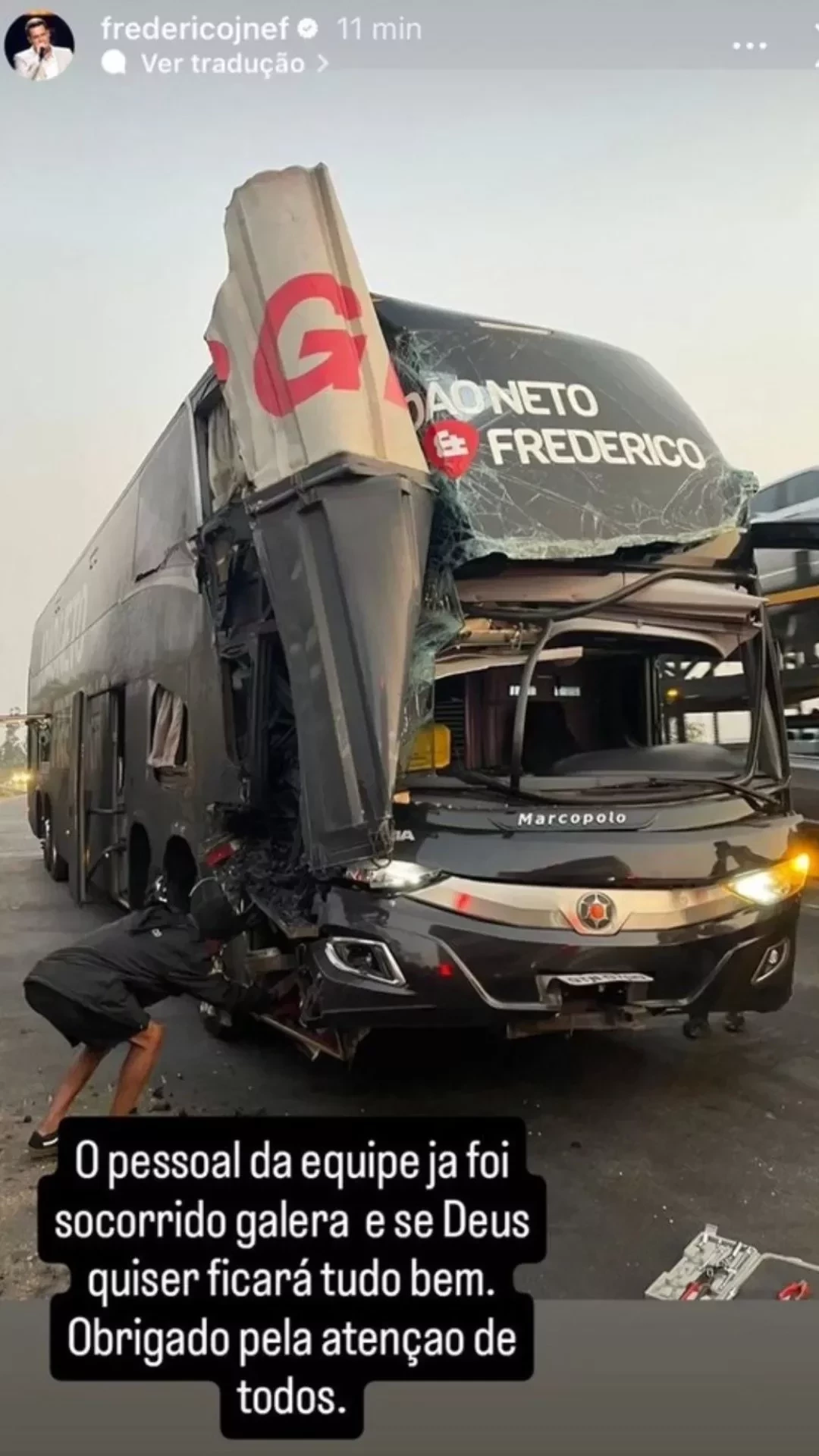 Nas redes sociais, Frederico compartilhou uma foto da frente do ônibus destruída e escreveu: ‘O pessoal da equipe já foi socorrido, galera. Se Deus quiser ficará tudo bem. Obrigado pela atenção de todos”.