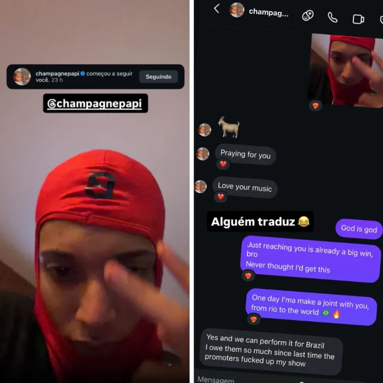 Pouco depois, Oruam mostrou um print de uma conversa com o próprio Drake. O astro respondeu a um story do brasileiro com o emoji de cabra — em inglês, goat, sigla para “greatest of all time”, ou “o melhor de todos os tempos”.