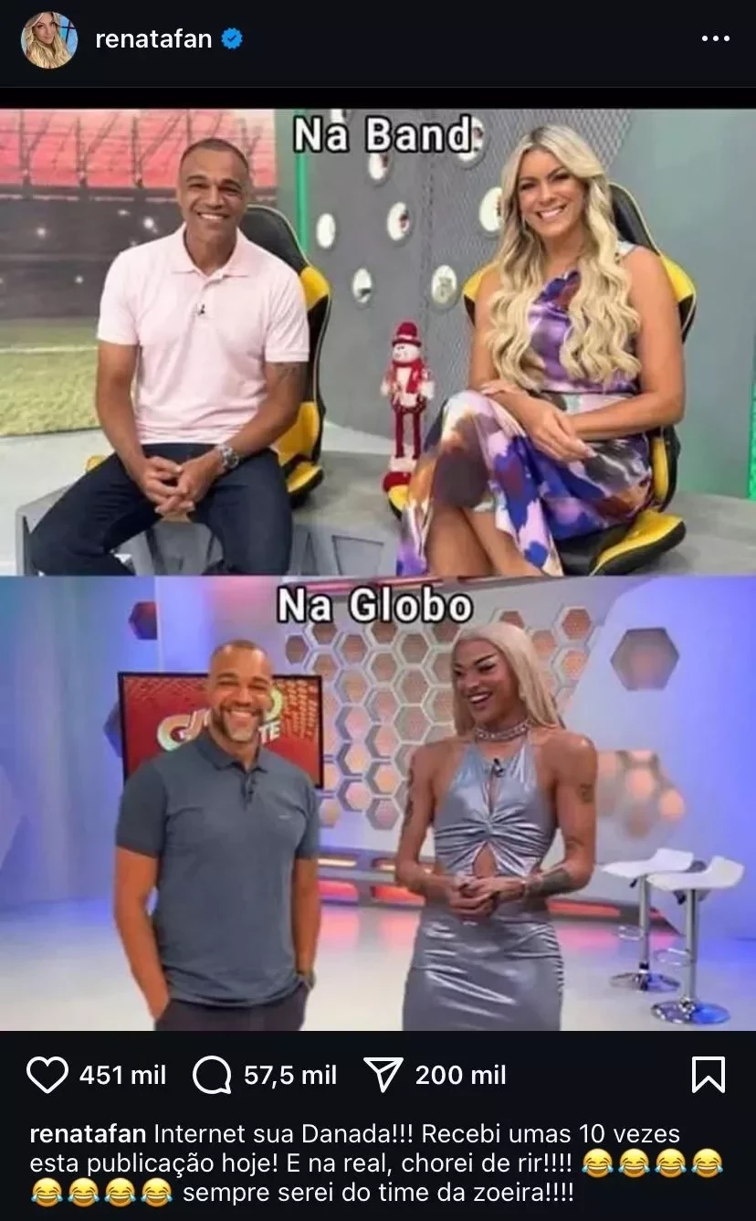 A apresentadora compartilhou em seu perfil no Instagram uma imagem que mostra Denilson ao seu lado na Band e, em outro momento, o comentarista com Vittar na Globo. "Internet, sua danada! Recebi umas dez vezes esta publicação hoje. E, na real, chorei de rir. Sempre serei do time da zoeira", legendou a apresentadora do Jogo Aberto. A publicação ainda segue no perfil de Renata.