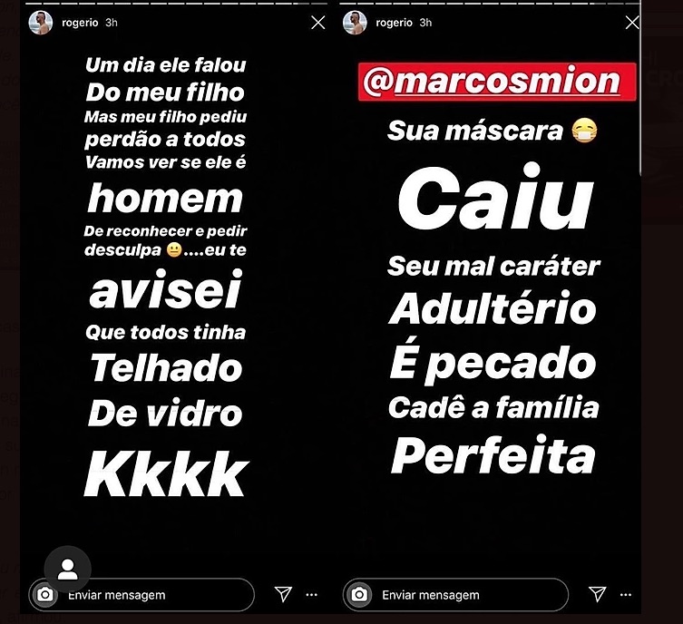 “Marcos Mion não poupou críticas ao meu filho MC Gui nos momentos mais tristes da nossa vida. Ele foi feroz e não teve empatia para compreender a dor que nos consumia”, começou Rogério. “Hoje, quando Mion vive seu drama familiar, e sofre por causa dos erros que cometeu, pensei em mostrar a ele como todos estamos sujeitos a falhas e deslizes”, continuou.
