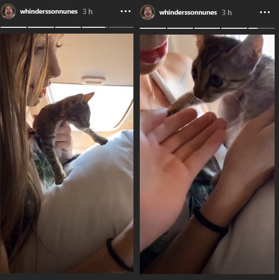 Na manhã dessa terça-feira (17.11), o casal publicou Stories mais uma vez a bordo de um jatinho executivo. Eles contaram com a presença ilustre da nova gatinha de estimação de Maria Lina, chamada Tapioca.