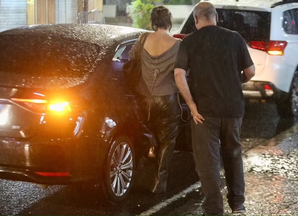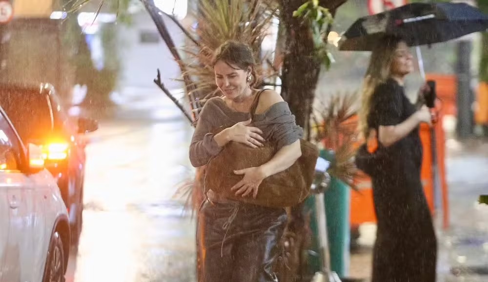 Paolla Oliveira, de 43 anos, foi surpreendida por um temporal na noite dessa quinta-feira (5) na Gávea, zona sul do Rio de Janeiro. A atriz deixava um restaurante após jantar com amigos quando precisou se abrigar da chuva a caminho do carro.