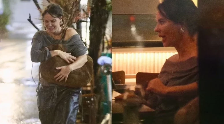 A atriz deixava um restaurante após jantar com amigos quando precisou se abrigar da chuva a caminho do carro