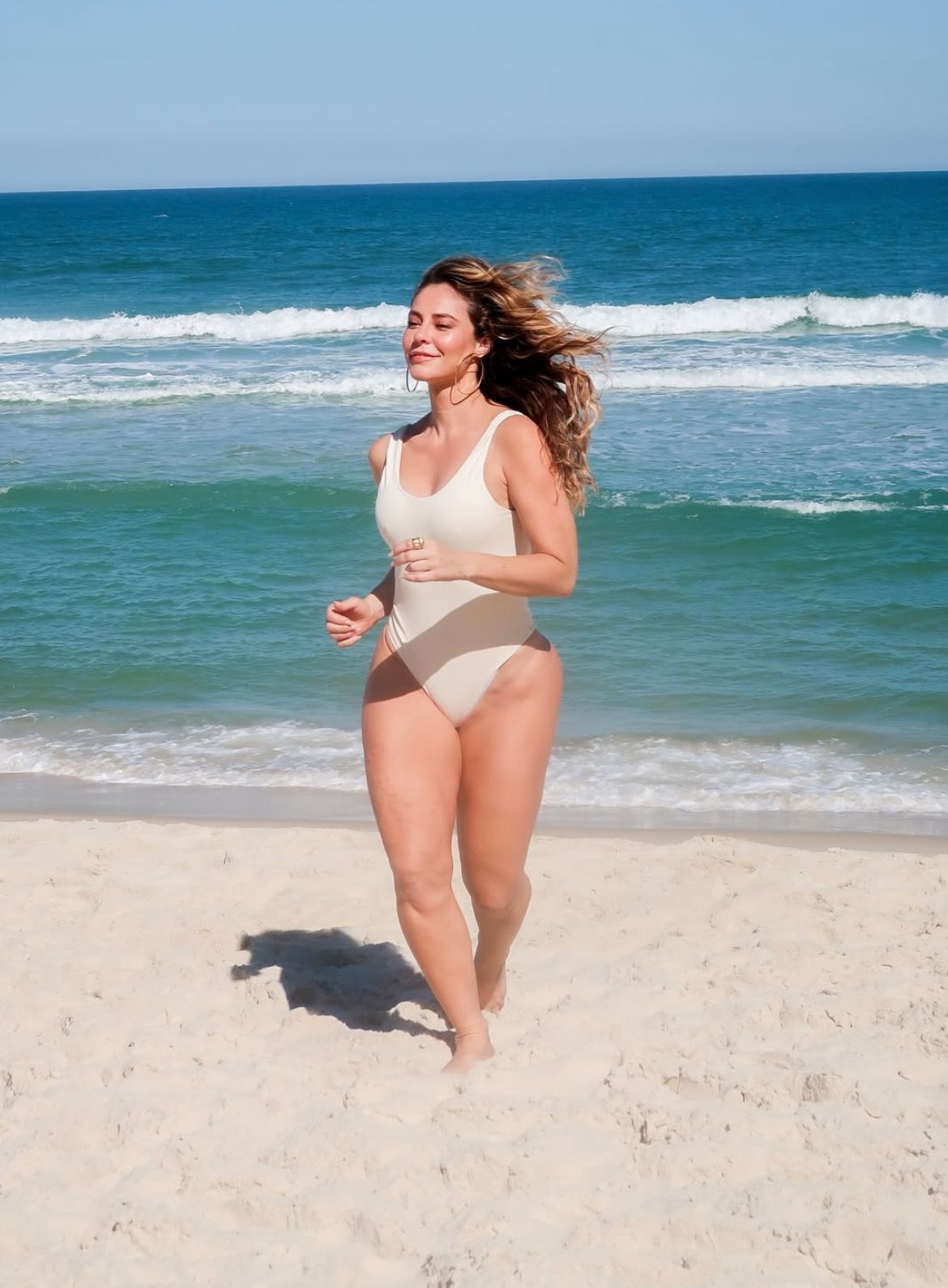 Paolla Oliveira, de 43 anos, aproveitou a quarta-feira (18) para curtir um dia de praia no Rio de Janeiro. A atriz foi flagrada correndo pelas areias da Barra da Tijuca, na Zona Oeste da cidade, usando um maiô na cor creme.