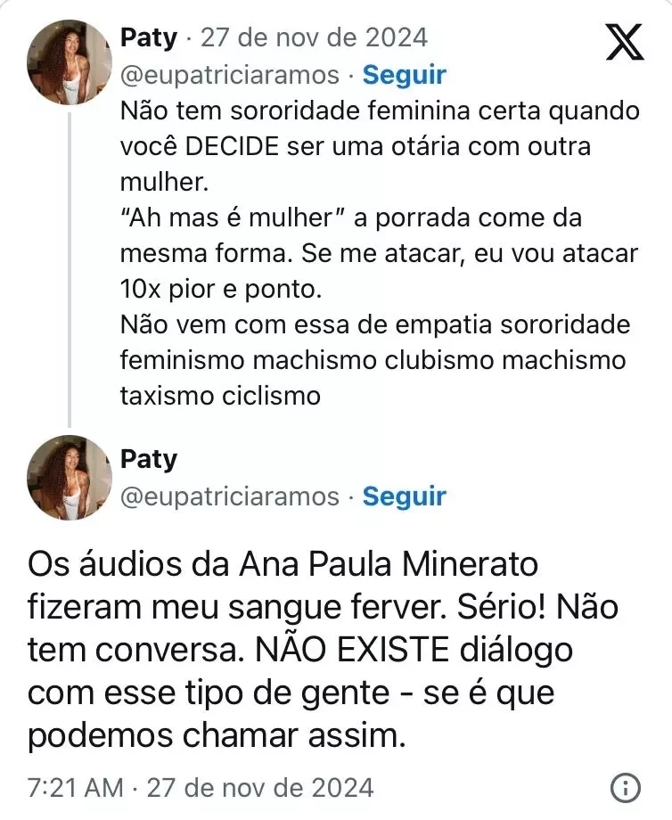 A influenciadora criticou o uso do feminismo e outros conceitos como justificativa, enfatizando sua indignação: “Os áudios da Ana Paula Minerato fizeram meu sangue ferver. Não tem conversa. NÃO EXISTE diálogo com esse tipo de gente – se é que podemos chamar assim”.