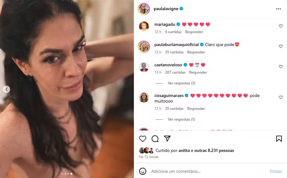 O post rapidamente viralizou e recebeu uma enxurrada de elogios. Entre os comentários, o do marido, Caetano Veloso, de 83 anos, chamou a atenção. O cantor reagiu com emojis de coração e um emoji com a palavra “on”, indicando que estava “ligado” nas fotos da esposa.