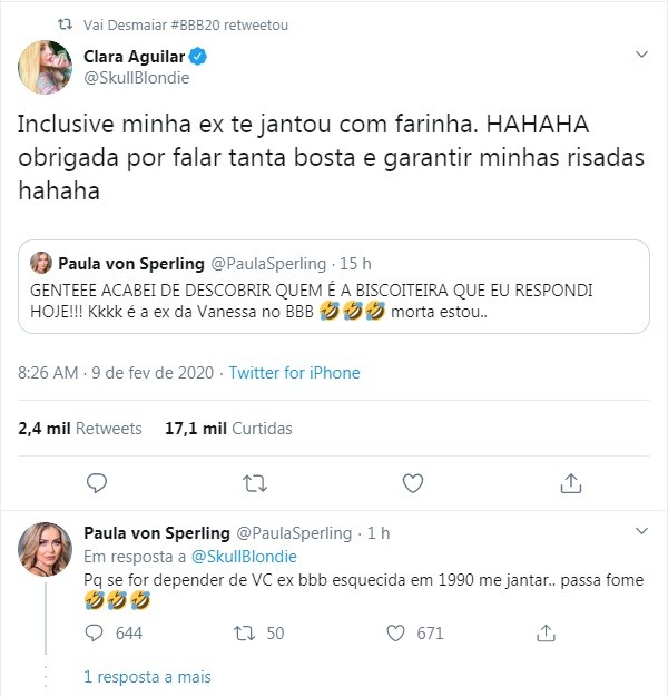 "Inclusive minha ex te jantou com farinha. HAHAHA obrigada por falar tanta bosta e garantir minhas risadas hahaha", rebateu Clara, se referindo a um momento no programa no qual Paula defendeu Petrix Barbosa das acusações de assédio e Vanessa, assim como Serginho Orgastic, reviraram os olhos e retrucaram o argumento.