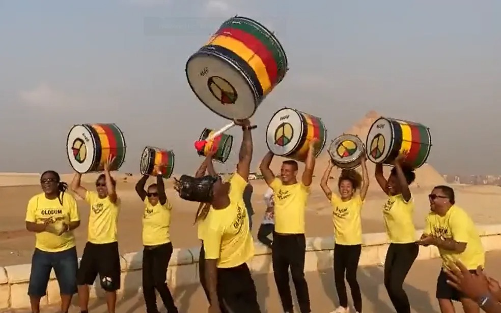Olodum toca Faraó diante as piramides do Egito. Foto: Reprodução