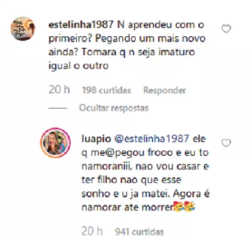 "Não aprendeu nada com o primeiro? Pegando um mais novo ainda? Tomara que não seja imaturo igual ao outro", escreveu a seguidora, fazendo referência a Pedro Scooby, ex-marido da apresentadora e atual namorado de Anitta.