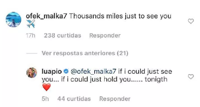 "Milhares de milhas só para te ver", comentou ele, em inglês, na foto da namorada. Luana respondeu à altura, citando uma parte da letra de Thousand Miles, música de Vanessa Carlton. "Se eu apenas pudesse te ver... Se eu apenas pudesse te abraçar... Esta noite."