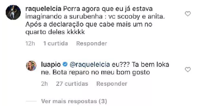 Ela também rebateu um comentário de outra seguidora a respeito do ex-marido. "Agora que eu já tava imaginando a surubinha entre você, Scooby e Anitta após a declaração que cabe mais um no quarto deles", escreveu uma fã.