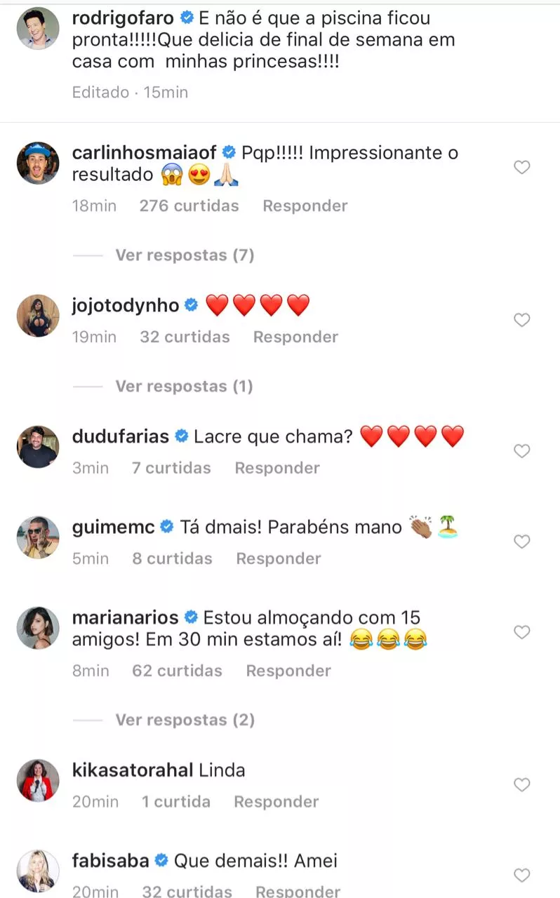 "Uau! Me convida?", "que piscina é essa? Estou chocada", "a piscina mais linda que já vi na vida. Parabéns", "que coisa mais linda essa piscina", "com essa piscina em casa, não precisa viajar nunca mais", "piscininha, amor", "resort particular é tudo de bom", "tão grande a sua piscina que achei que era uma praia", "a piscina da sua casa é praticamente um lago", comentaram os seguidores.