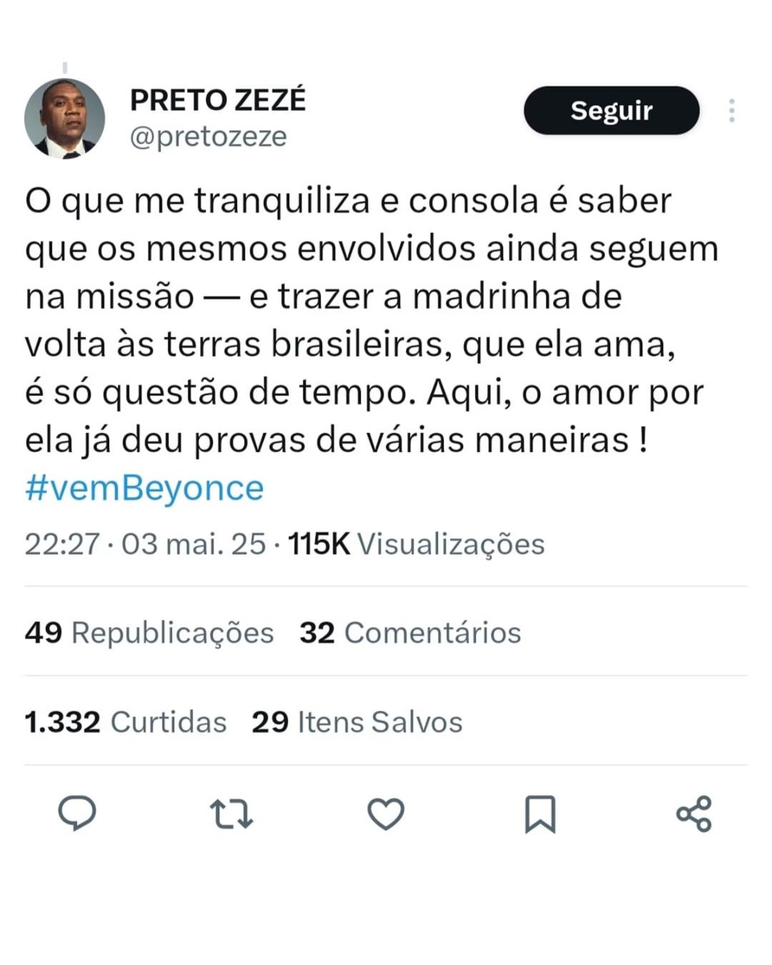 O que me tranquiliza e consola é saber que os mesmos envolvidos ainda seguem na missão — e trazer a madrinha de volta às terras brasileiras, que ela ama, é só questão de tempo. Aqui, o amor por ela já deu provas de várias maneiras! #vemBeyonce
