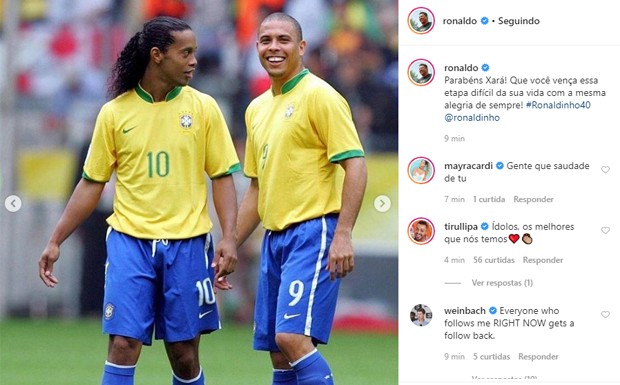 "Parabéns Xará! Que você vença essa etapa difícil da sua vida com a mesma alegria de sempre! #Ronaldinho40 @ronaldinho", postou Ronaldo. "Que papai do céu abençoe @ronaldinho", publicou Adriano.
