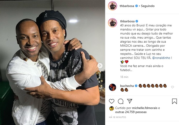"40 anos do Bruxo! E meu coração me mandou vir aqui... Gritar pra todo mundo que eu desejo tudo de melhor na sua vida, meu amigo... Que tantas alegrias nos deu ao longo de sua mágica carreira... Obrigado por sempre me tratar com carinho e respeito... Saúde e Luz no seu caminho! Sou teu fã, @ronaldinho. Você me fez amar mais ainda o futebol...", escreveu Thiaguinho.