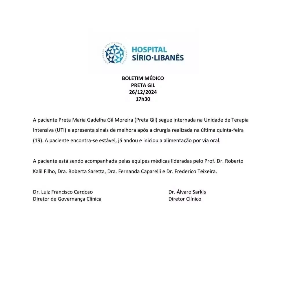 Preta Gil, de 50 anos, permanece internada na Unidade de Terapia Intensiva (UTI) do hospital Sírio-Libanês, em São Paulo, mas tem mostrado “sinais de melhora” após uma complexa cirurgia para a remoção de tumores. A informação foi divulgada nesta quinta-feira (26) em um boletim médico compartilhado nas redes sociais da artista.
